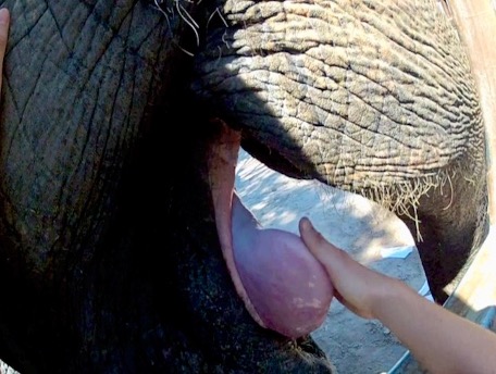 Figure 2: Elephant receives a tongue-scratch from her caregiver at Busch Gardens in Tampa Bay. Image by A.M. Lacinak